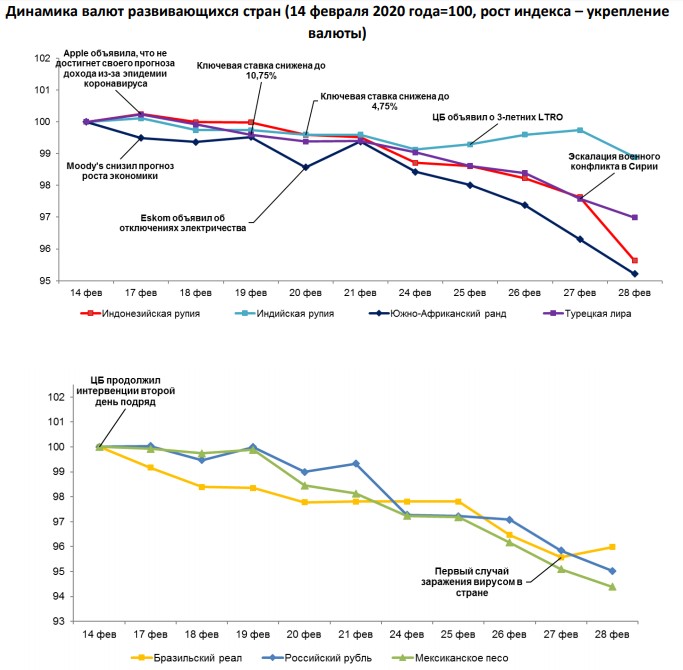 - бразильский реал ослаб на 1,8% (с 4,39 до 4,47) на фоне обнаружения первого случая заражения коронавирусом в стране, ЦБ предпринял меры по поддержке национальной валюты через своп операции;