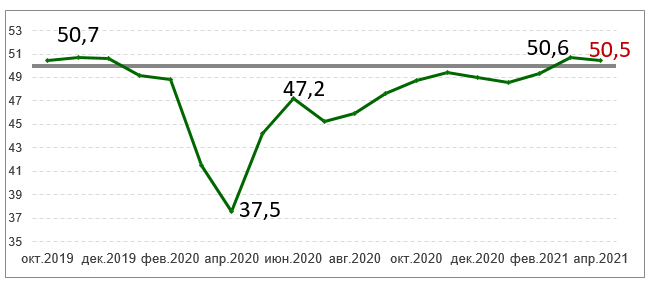По результатам полученных оценок, индекс деловой активности в апреле незначительно замедлился, составив 50,5 (в марте – 50,6).