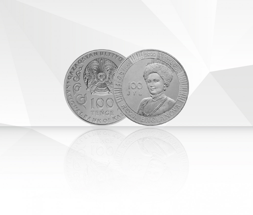 Монеты из мельхиора номиналом 100 тенге продолжают серию «Выдающиеся события и люди». В 2022 году исполнилось 100 лет народному артисту СССР, Народному герою Казахстана, советской, казахской оперной и эстрадной певице Розе Баглановой.