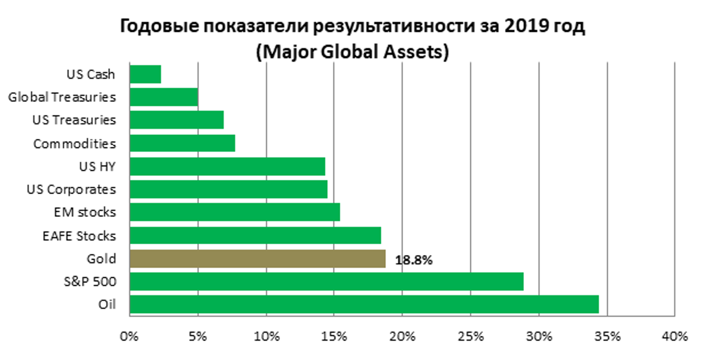 «По итогам 2019 года цена на золото выросла с $1282 до $1523 за 1 тройскую унцию, продемонстрировав рост 19% за год и превзойдя по результативности мировые индексы облигаций и акций развивающихся рынков. Это лучший результат с 2010 года», – сказал он.