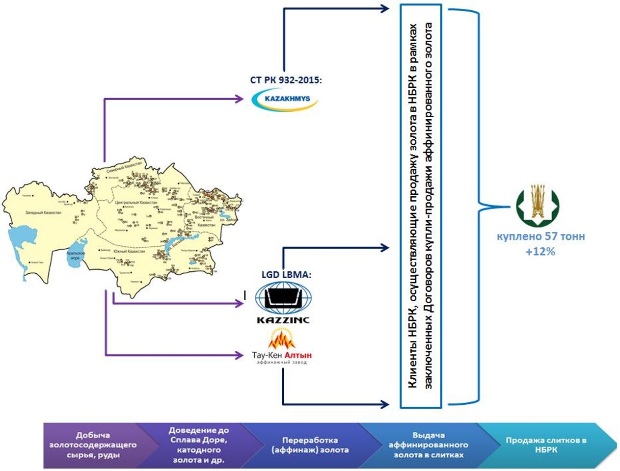 Нацбанк приобретает только конечный продукт в виде аффинированных слитков национального и международного стандарта, произведенных на мощностях местных аффинажных заводов ТОО «Kazakhmys Smelting», ТОО «Казцинк» и ТОО «Тау-Кен Алтын». На текущий момент ТОО «Казцинк» и ТОО «Тау-Кен Алтын» являются производителями аффинированного золота международного стандарта «London Good Delivery» (LGD). С 2017 года завод ТОО «Тау-Кен Алтын» вел работу по получению сертификата LGD и в сентябре 2019 года получил мировое признание. Балхашский завод ТОО «Kazakhmys Smelting» производит аффинированное золото национального стандарта.
