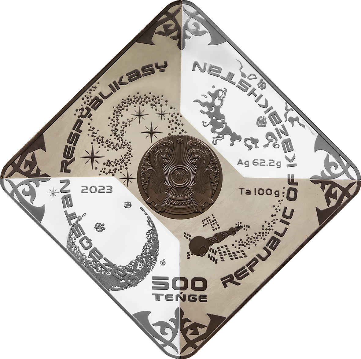 Составная коллекционная монета TÁŃIRLIK TANYM изготовлена по сложной технологии из серебра 925/1000 пробы со вставкой из тантала. Общая масса монеты – 162,2 грамма, диаметр – 50 мм, качество изготовления – proof, номинал – 500 тенге, тираж изготовления – 500 (пятьсот) штук.
