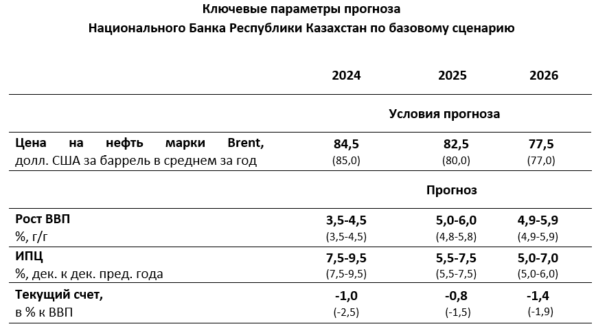 Прогноз по росту экономики Казахстана на 2024 год сохранен на уровне 3,5-4,5%, на 2026 год – на уровне 4,9-5,9%. Прогноз на 2025 год несколько повышен до 5-6%. Рост ВВП в 2024-2026 годах будет обеспечиваться в основном за счет внутреннего спроса, в том числе на фоне роста фискального стимулирования. В 2025 и 2026 годах поддержку росту экономики также окажет нефтяной сектор в результате увеличения добычи. По оценкам Национального Банка, в течение прогнозного периода экономика будет расти в условиях расширения спроса, опережающего возможности предложения. Это будет оказывать проинфляционное давление.