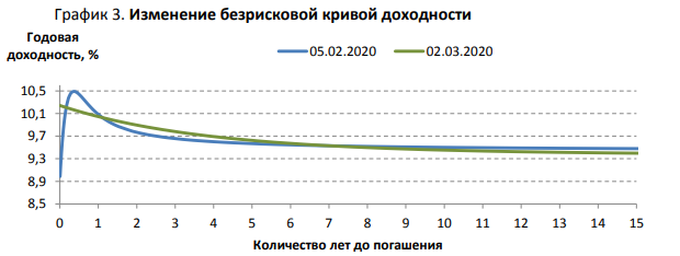 По состоянию на начало марта 2020 года кривая доходности3 сохранила инверсионный характер. Тем не менее, в сравнении с началом февраля 2020 года наблюдается ее выравнивание за счет сглаживания скачка доходностей в сегменте до года. В целом сохраняется тренд более высокой доходности краткосрочных бумаг относительно бумаг с более длительным сроком до погашения.