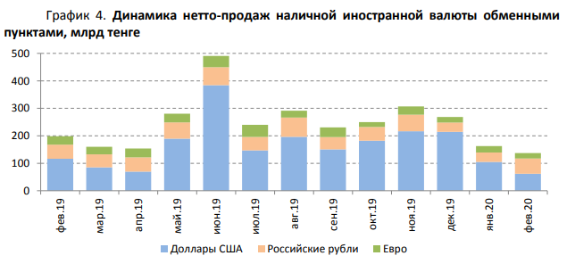 В феврале 2020 года население купило на нетто-основе наличную иностранную валюту на сумму, эквивалентную 137,1 млрд тенге (в январе 2020 года – 163,4 млрд тенге). Основной объем расходов был направлен на покупку долларов США – 45,2%, или 61,9 млрд тенге, российских рублей – 40,5%, или 55,6 млрд тенге, евро – 14,3%, или 19,6 млрд тенге. По сравнению с предыдущим месяцем данные расходы уменьшились на 16,1%. В разбивке по видам валют расходы на покупку долларов США уменьшились на 40,9%, евро – на 16,1%, расходы на покупку российских рублей увеличились на 61,0%.
