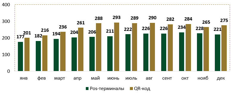 Количество платежей через QR-код и POS-терминалы (в млн ед.)